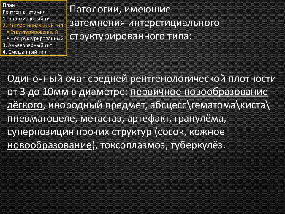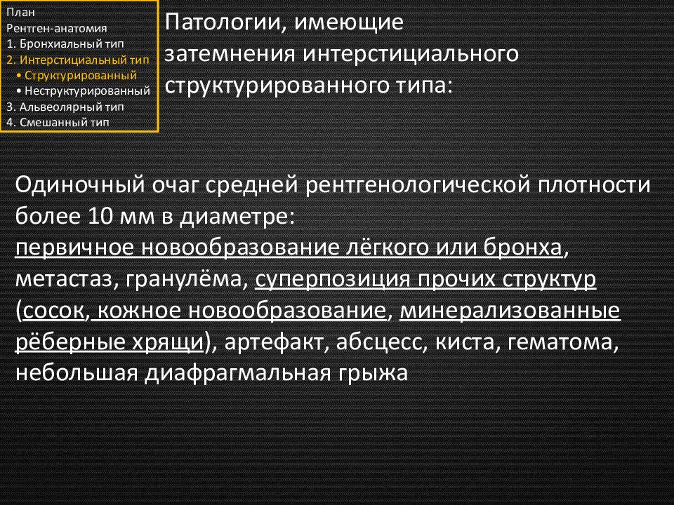 Патологии, имеющие затемнения интерстициального структурированного типа: План Рентген-анатомия 1. Бронхиальный тип 2. Интерстициальный тип • Структурированный • Неструктурированный 3. Альвеолярный тип 4. Смешанный тип Одиночный очаг средней рентгенологической плотности более 10 мм в диаметре: первичное новообразование лёгкого или бронха, метастаз, гранулёма, суперпозиция прочих структур ( сосок, кожное новообразование, минерализованные рёберные хрящи ), артефакт, абсцесс, киста, гематома, небольшая диафрагмальная грыжа