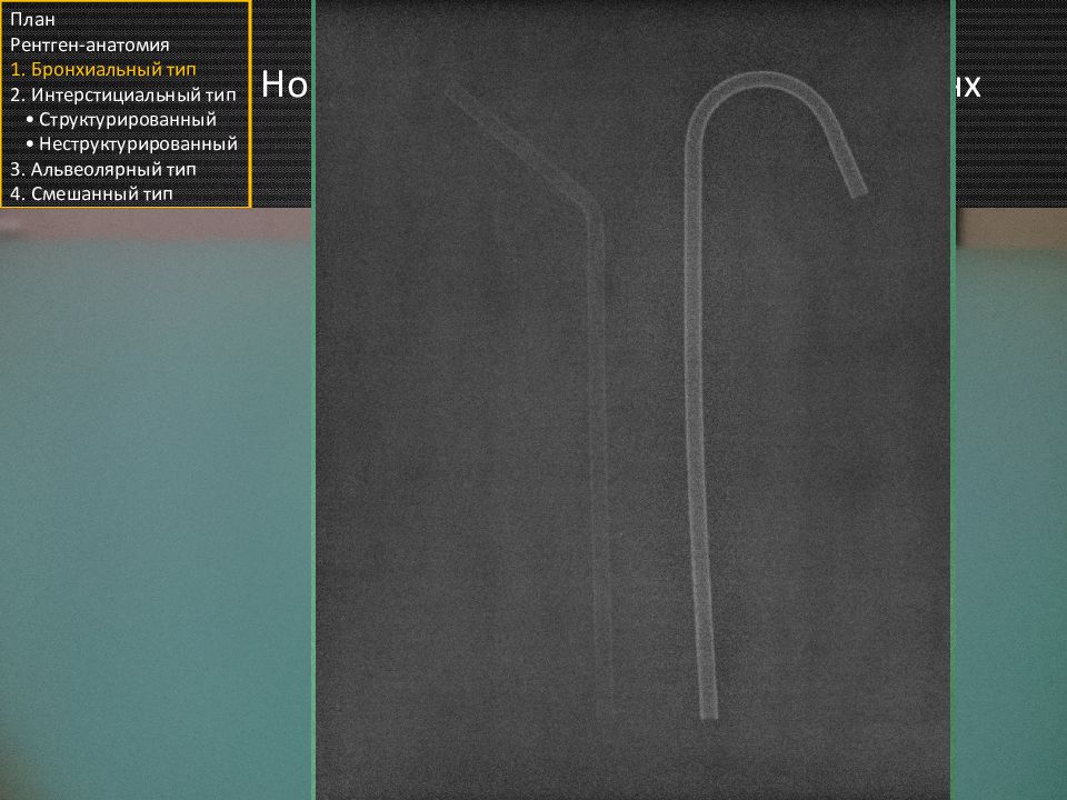 Нормальный бронх \ изменённый бронх План Рентген-анатомия 1. Бронхиальный тип 2. Интерстициальный тип • Структурированный • Неструктурированный 3. Альвеолярный тип 4. Смешанный тип