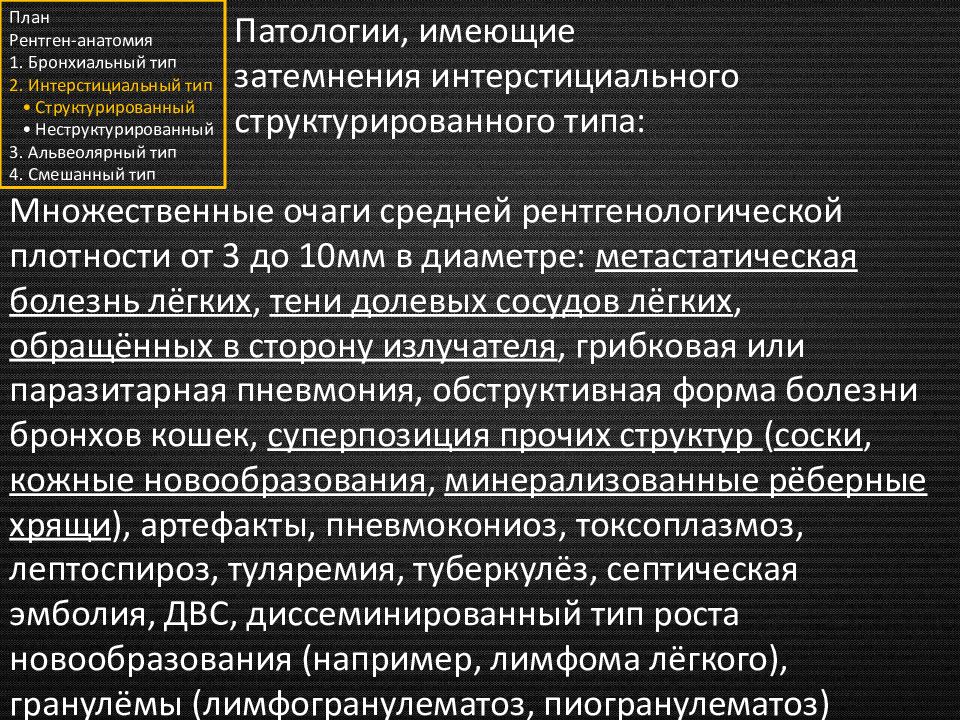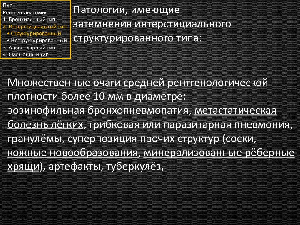 Патологии, имеющие затемнения интерстициального структурированного типа: План Рентген-анатомия 1. Бронхиальный тип 2. Интерстициальный тип • Структурированный • Неструктурированный 3. Альвеолярный тип 4. Смешанный тип Множественные очаги средней рентгенологической плотности более 10 мм в диаметре: эозинофильная бронхопневмопатия, метастатическая болезнь лёгких, грибковая или паразитарная пневмония, гранулёмы, суперпозиция прочих структур ( соски, кожные новообразования, минерализованные рёберные хрящи ), артефакты, туберкулёз,