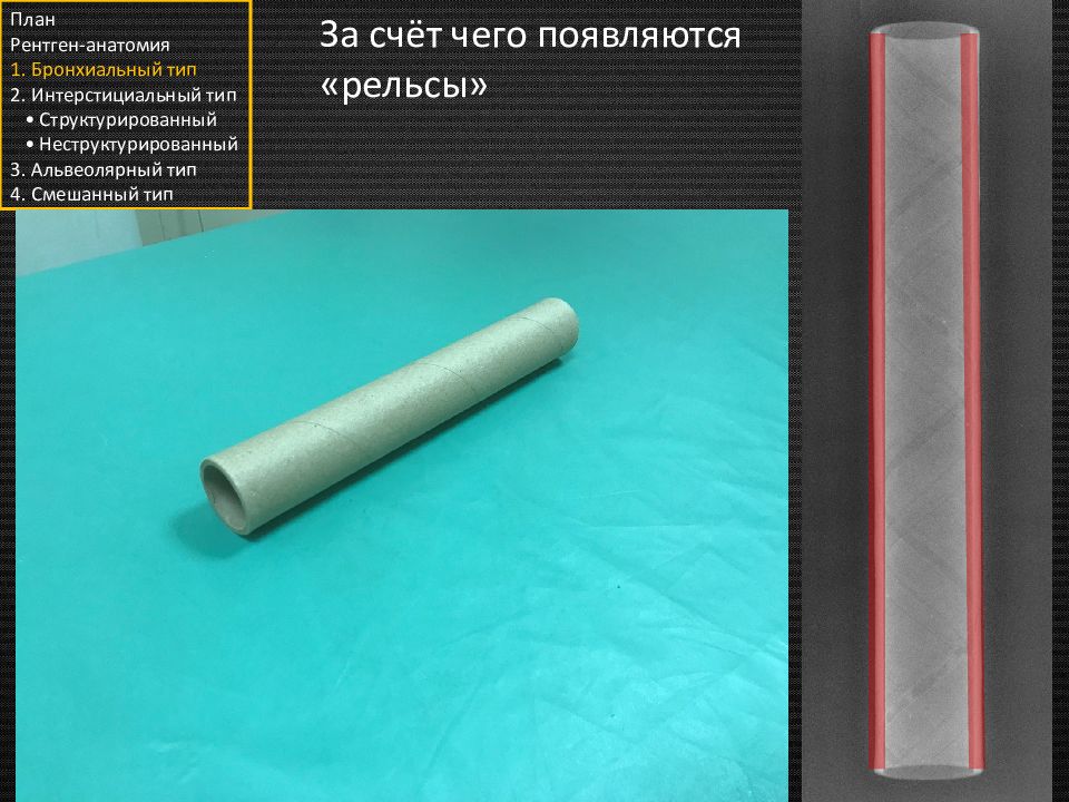 За счёт чего появляются «рельсы» План Рентген-анатомия 1. Бронхиальный тип 2. Интерстициальный тип • Структурированный • Неструктурированный 3. Альвеолярный тип 4. Смешанный тип