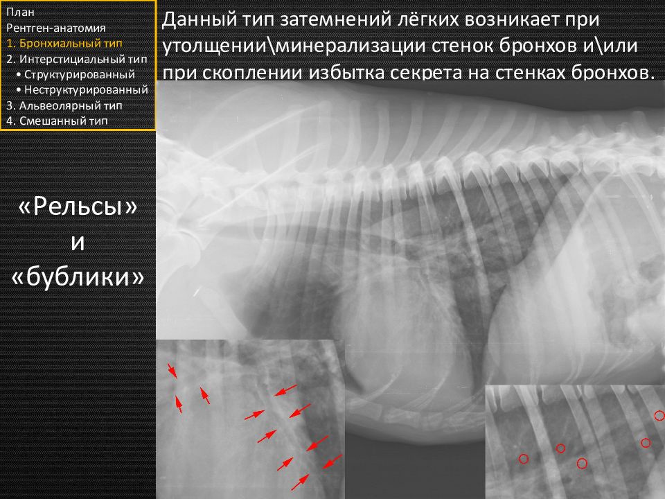 Данный тип затемнений лёгких возникает при утолщении\минерализации стенок бронхов и\или при скоплении избытка секрета на стенках бронхов. План Рентген-анатомия 1. Бронхиальный тип 2. Интерстициальный тип • Структурированный • Неструктурированный 3. Альвеолярный тип 4. Смешанный тип «Рельсы» и «бублики»