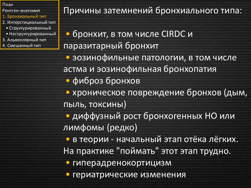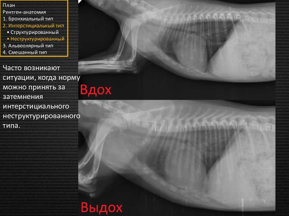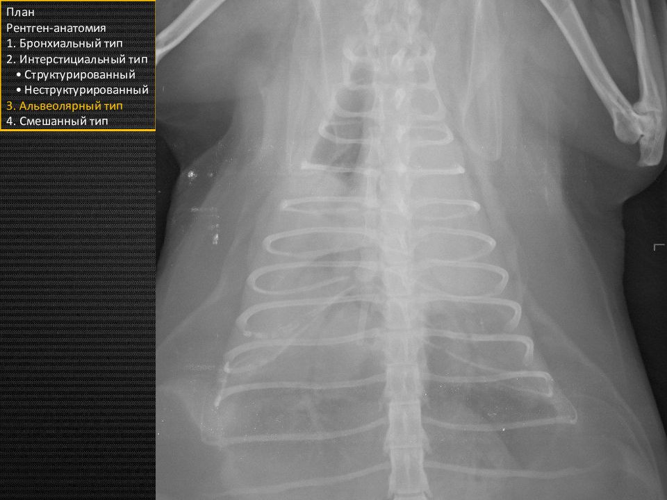 Причины затемнений бронхиального типа: • бронхит, в том числе CIRDC и паразитарный бронхит • эозинофильные патологии, в том числе астма и эозинофильная бронхопатия • фиброз бронхов • хроническое повреждение бронхов (дым, пыль, токсины ) • диффузный рост бронхогенных НО или лимфомы (редко ) • в теории - начальный этап отёка лёгких. На практике "поймать" этот этап трудно. • гиперадренокортицизм • гериатрические изменения План Рентген-анатомия 1. Бронхиальный тип 2. Интерстициальный тип • Структурированный • Неструктурированный 3. Альвеолярный тип 4. Смешанный тип