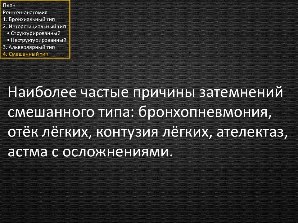 План Рентген-анатомия 1. Бронхиальный тип 2. Интерстициальный тип • Структурированный • Неструктурированный 3. Альвеолярный тип 4. Смешанный тип Наиболее частые причины затемнений смешанного типа: бронхопневмония, отёк лёгких, контузия лёгких, ателектаз, астма с осложнениями.