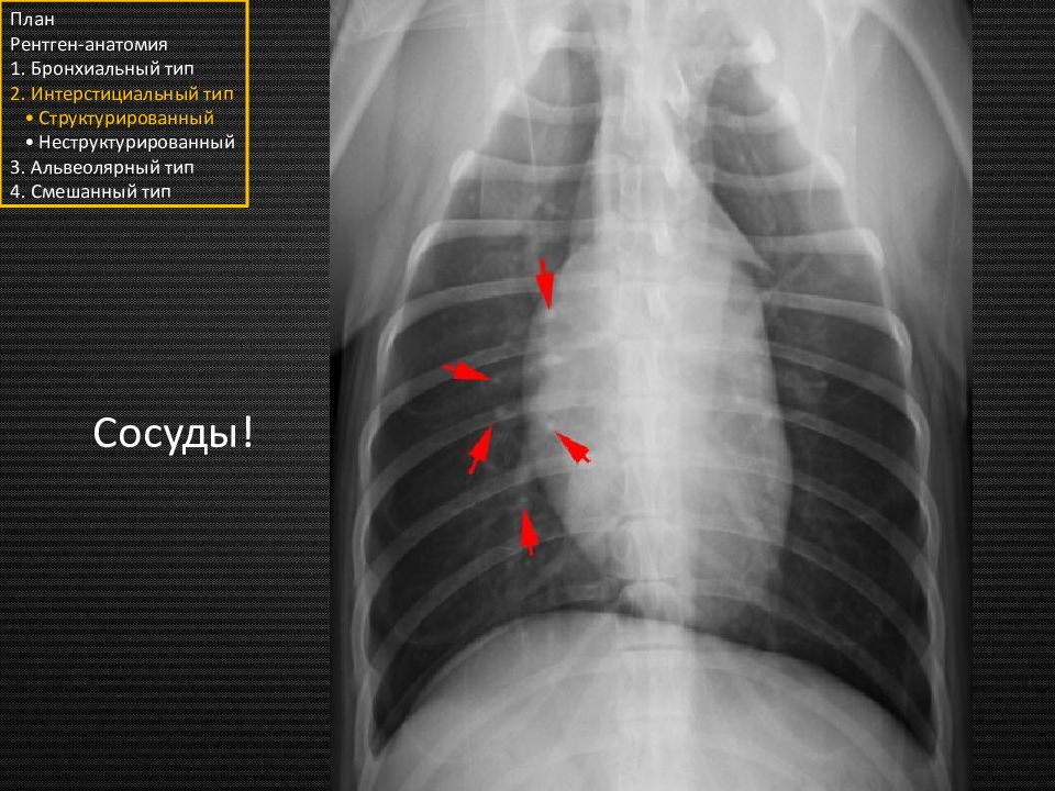 План Рентген-анатомия 1. Бронхиальный тип 2. Интерстициальный тип • Структурированный • Неструктурированный 3. Альвеолярный тип 4. Смешанный тип Сосуды!
