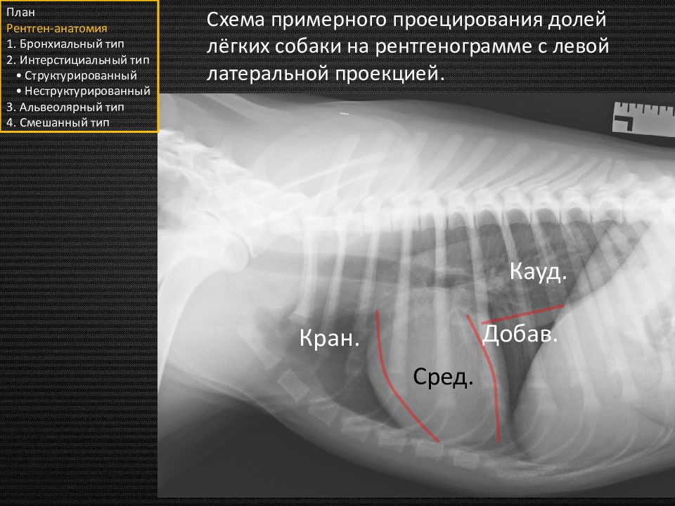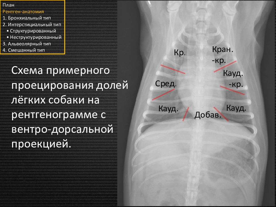 Схема примерного проецирования долей лёгких собаки на рентгенограмме с вентро-дорсальной проекцией. Кран.-кр. Кауд. - кр. Кауд. Добав. Кауд. Сред. Кр. План Рентген-анатомия 1. Бронхиальный тип 2. Интерстициальный тип • Структурированный • Неструктурированный 3. Альвеолярный тип 4. Смешанный тип
