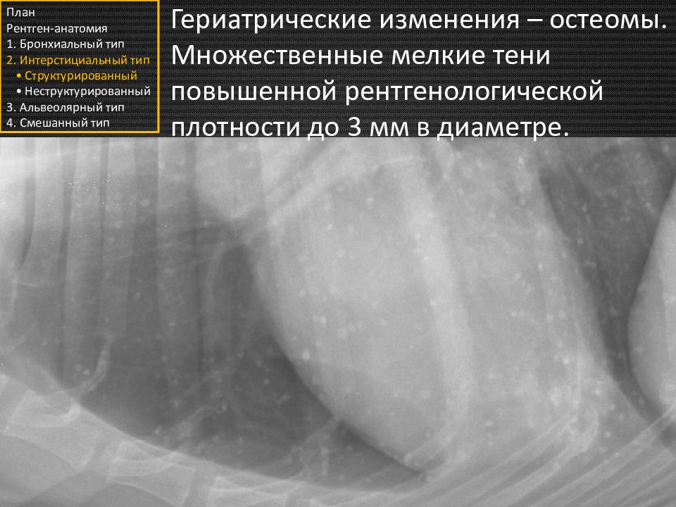 План Рентген-анатомия 1. Бронхиальный тип 2. Интерстициальный тип • Структурированный • Неструктурированный 3. Альвеолярный тип 4. Смешанный тип Гериатрические изменения – остеомы. Множественные мелкие тени повышенной рентгенологической плотности до 3 мм в диаметре.