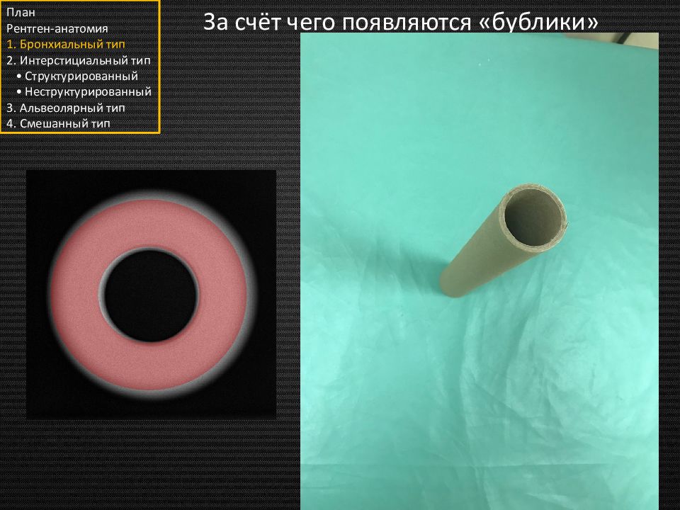 За счёт чего появляются «бублики» План Рентген-анатомия 1. Бронхиальный тип 2. Интерстициальный тип • Структурированный • Неструктурированный 3. Альвеолярный тип 4. Смешанный тип