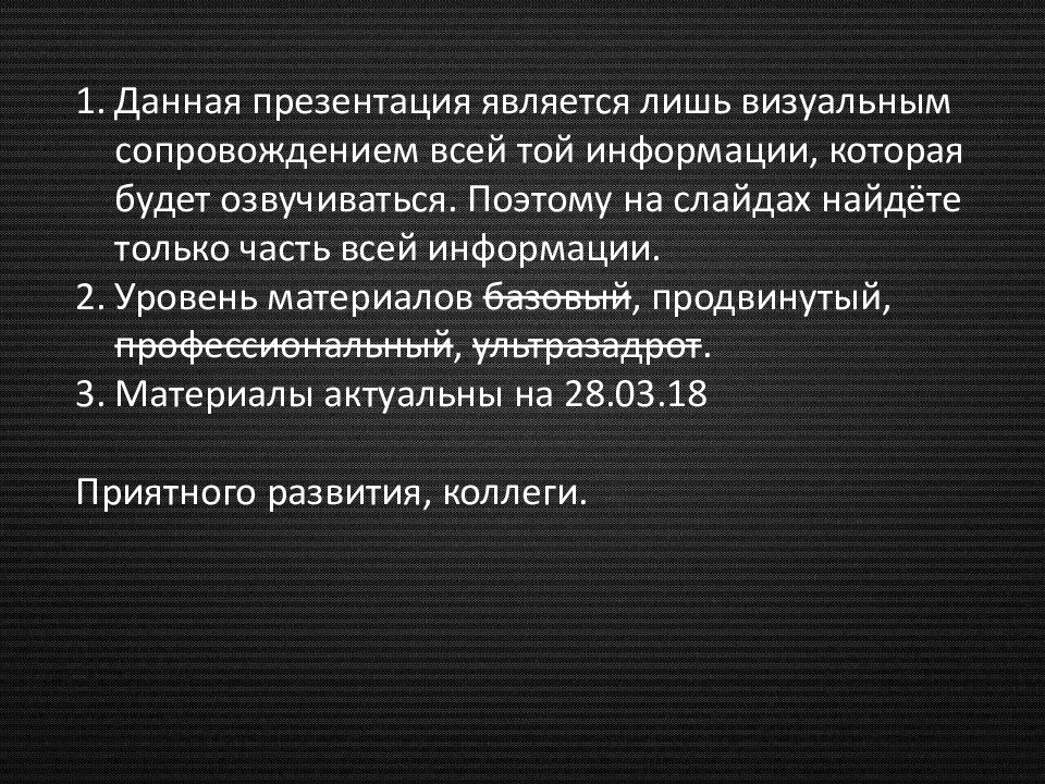 Данная презентация является лишь визуальным сопровождением всей той информации, которая будет озвучиваться. Поэтому на слайдах найдёте только часть всей информации. Уровень материалов базовый, продвинутый, профессиональный, ультразадрот. Материалы актуальны на 28.03.18 Приятного развития, коллеги.
