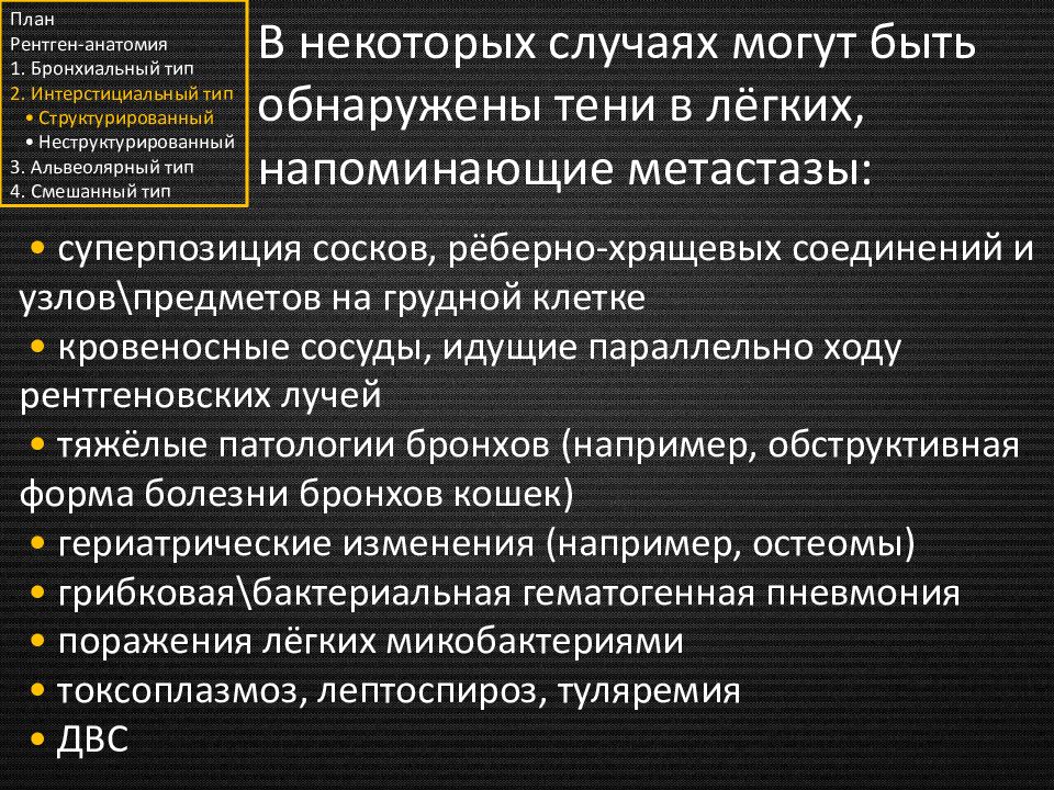 В некоторых случаях могут быть обнаружены тени в лёгких, напоминающие метастазы: План Рентген-анатомия 1. Бронхиальный тип 2. Интерстициальный тип • Структурированный • Неструктурированный 3. Альвеолярный тип 4. Смешанный тип • суперпозиция сосков, рёберно-хрящевых соединений и узлов\предметов на грудной клетке • кровеносные сосуды, идущие параллельно ходу рентгеновских лучей • тяжёлые патологии бронхов (например, обструктивная форма болезни бронхов кошек) • гериатрические изменения (например, остеомы) • грибковая\бактериальная гематогенная пневмония • поражения лёгких микобактериями • токсоплазмоз, лептоспироз, туляремия • ДВС
