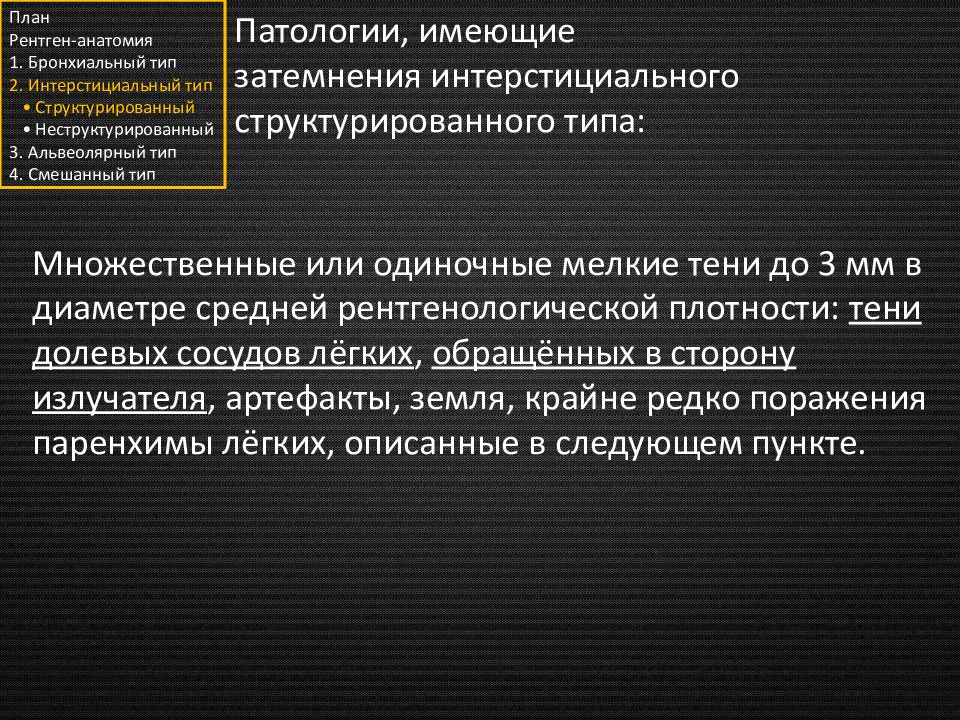 Патологии, имеющие затемнения интерстициального структурированного типа: План Рентген-анатомия 1. Бронхиальный тип 2. Интерстициальный тип • Структурированный • Неструктурированный 3. Альвеолярный тип 4. Смешанный тип Множественные или одиночные мелкие тени до 3 мм в диаметре средней рентгенологической плотности: тени долевых сосудов лёгких, обращённых в сторону излучателя, артефакты, земля, крайне редко поражения паренхимы лёгких, описанные в следующем пункте.