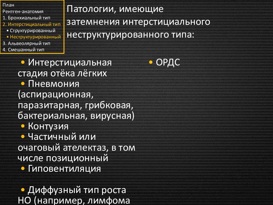 План Рентген-анатомия 1. Бронхиальный тип 2. Интерстициальный тип • Структурированный • Неструктурированный 3. Альвеолярный тип 4. Смешанный тип Патологии, имеющие затемнения интерстициального неструктурированного типа: • Интерстициальная стадия отёка лёгких • Пневмония (аспирационная, паразитарная, грибковая, бактериальная, вирусная) • Контузия • Частичный или очаговый ателектаз, в том числе позиционный • Гиповентиляция • Диффузный тип роста НО (например, лимфома лёгкого) • Коагулопатии • Фиброз • Эозинофильная пневмопатия • ОРДС
