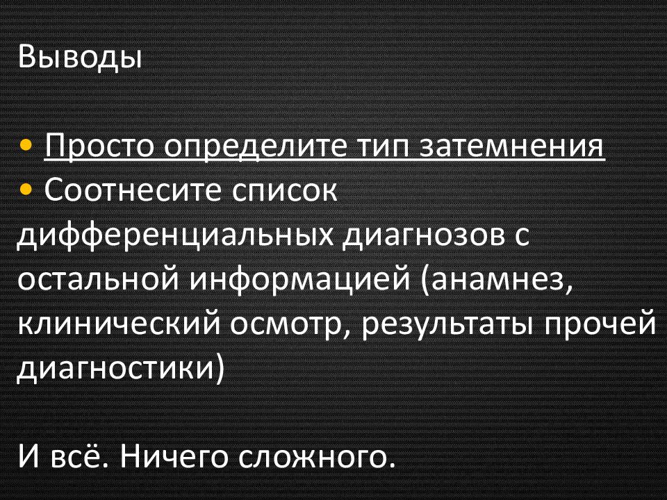 Выводы • Просто определите тип затемнения • Соотнесите список дифференциальных диагнозов с остальной информацией (анамнез, клинический осмотр, результаты прочей диагностики) И всё. Ничего сложного.