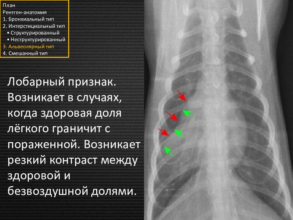 Лобарный признак. Возникает в случаях, когда здоровая доля лёгкого граничит с пораженной. Возникает резкий контраст между здоровой и безвоздушной долями. План Рентген-анатомия 1. Бронхиальный тип 2. Интерстициальный тип • Структурированный • Неструктурированный 3. Альвеолярный тип 4. Смешанный тип
