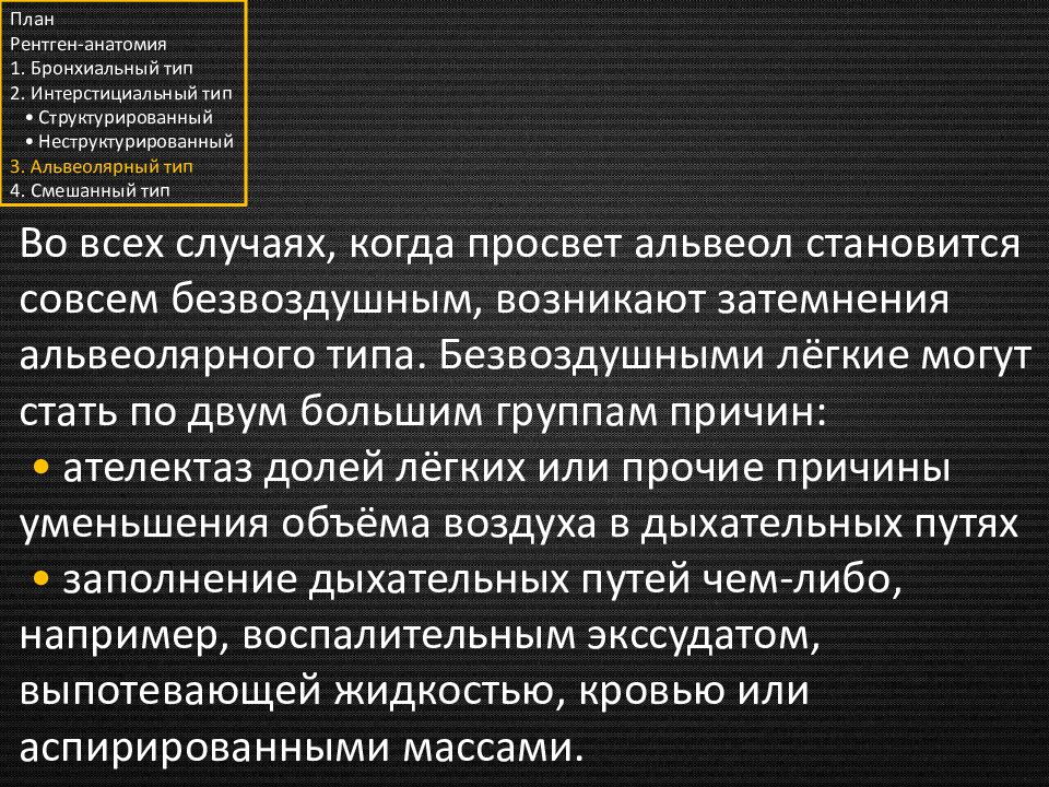 Во всех случаях, когда просвет альвеол становится совсем безвоздушным, возникают затемнения альвеолярного типа. Безвоздушными лёгкие могут стать по двум большим группам причин: • ателектаз долей лёгких или прочие причины уменьшения объёма воздуха в дыхательных путях • заполнение дыхательных путей чем-либо, например, воспалительным экссудатом, выпотевающей жидкостью, кровью или аспирированными массами. План Рентген-анатомия 1. Бронхиальный тип 2. Интерстициальный тип • Структурированный • Неструктурированный 3. Альвеолярный тип 4. Смешанный тип