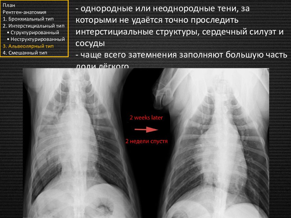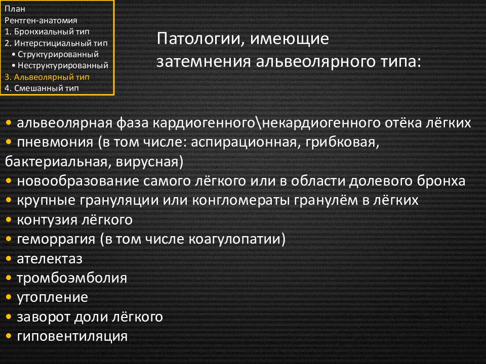 Патологии, имеющие затемнения альвеолярного типа: План Рентген-анатомия 1. Бронхиальный тип 2. Интерстициальный тип • Структурированный • Неструктурированный 3. Альвеолярный тип 4. Смешанный тип • альвеолярная фаза кардиогенного\некардиогенного отёка лёгких • пневмония (в том числе: аспирационная, грибковая, бактериальная, вирусная) • новообразование самого лёгкого или в области долевого бронха • крупные грануляции или конгломераты гранулём в лёгких • контузия лёгкого • геморрагия (в том числе коагулопатии ) • ателектаз • тромбоэмболия • утопление • заворот доли лёгкого • гиповентиляция