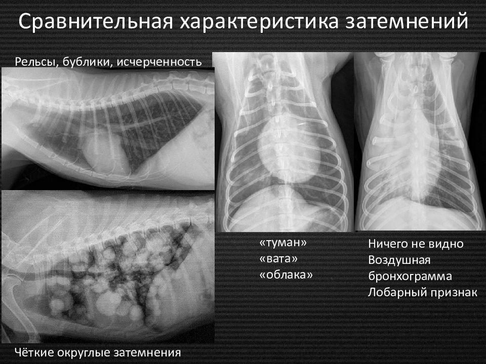 Сравнительная характеристика затемнений Рельсы, бублики, исчерченность Чёткие округлые затемнения «туман» «вата» «облака» Ничего не видно Воздушная бронхограмма Лобарный признак