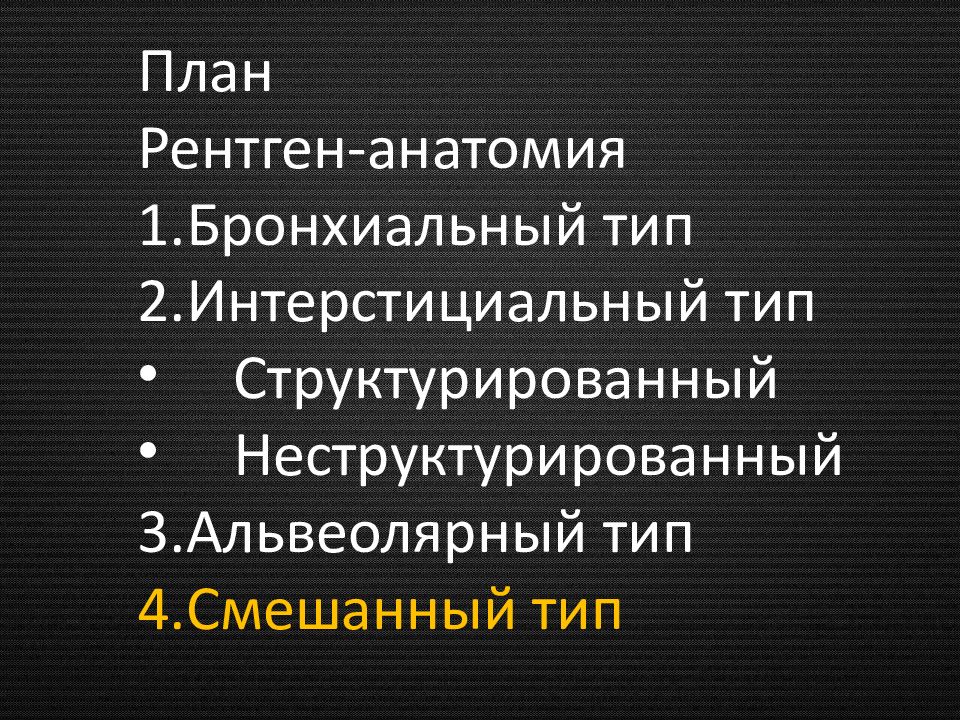 План Рентген-анатомия Бронхиальный тип Интерстициальный тип Структурированный Неструктурированный 3.Альвеолярный тип 4.Смешанный тип