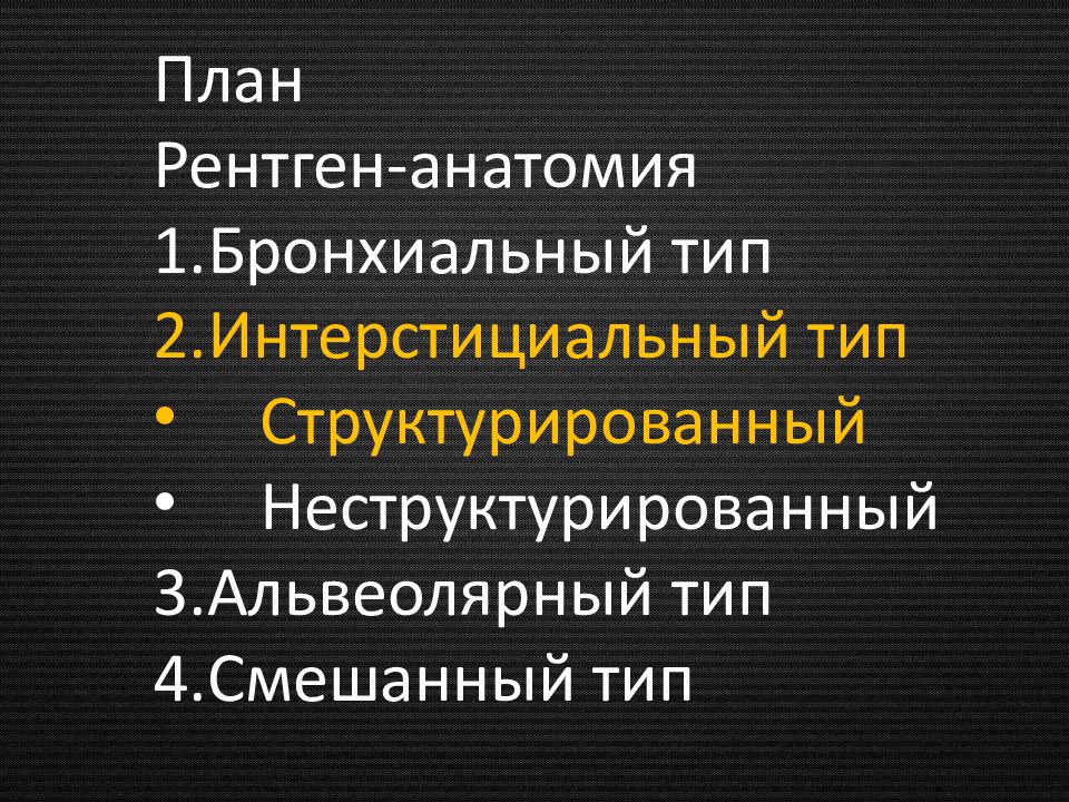 Множественные очаги средней рентгенологической плотности от 3 до 10мм в диаметре План Рентген-анатомия 1. Бронхиальный тип 2. Интерстициальный тип • Структурированный • Неструктурированный 3. Альвеолярный тип 4. Смешанный тип