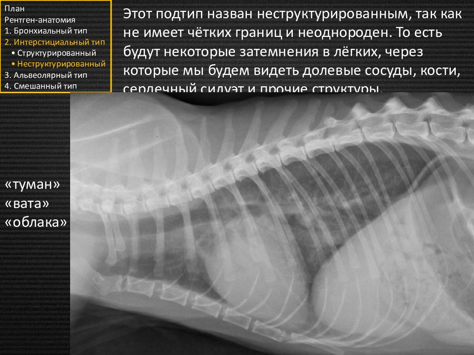 Этот подтип назван неструктурированным, так как не имеет чётких границ и неоднороден. То есть будут некоторые затемнения в лёгких, через которые мы будем видеть долевые сосуды, кости, сердечный силуэт и прочие структуры. План Рентген-анатомия 1. Бронхиальный тип 2. Интерстициальный тип • Структурированный • Неструктурированный 3. Альвеолярный тип 4. Смешанный тип «туман» «вата» «облака»