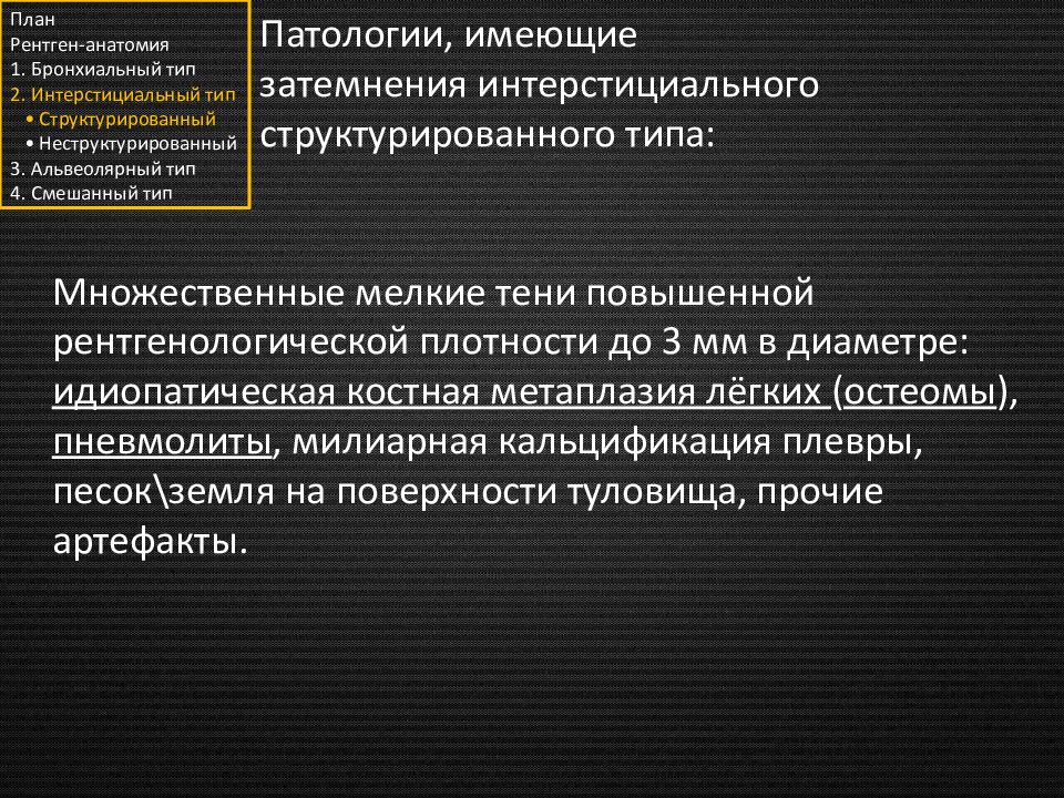 Патологии, имеющие затемнения интерстициального структурированного типа: План Рентген-анатомия 1. Бронхиальный тип 2. Интерстициальный тип • Структурированный • Неструктурированный 3. Альвеолярный тип 4. Смешанный тип Множественные мелкие тени повышенной рентгенологической плотности до 3 мм в диаметре: идиопатическая костная метаплазия лёгких ( остеомы ), пневмолиты, милиарная кальцификация плевры, песок\земля на поверхности туловища, прочие артефакты.