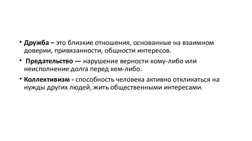 Дружба – это близкие отношения, основанные на взаимном доверии, привязанности, общности интересов. Предательство — нарушение верности кому-либо или неисполнение долга перед кем-либо. Коллективизм - способность человека активно откликаться на нужды других людей, жить общественными интересами.