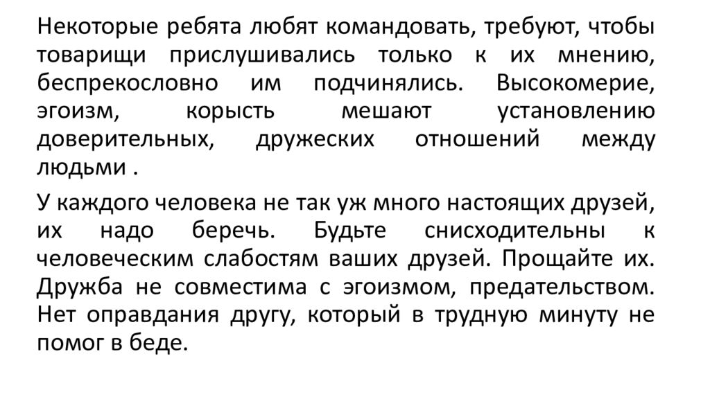 Некоторые ребята любят командовать, требуют, чтобы товарищи прислушивались только к их мнению, беспрекословно им подчинялись. Высокомерие, эгоизм, корысть мешают установлению доверительных, дружеских отношений между людьми. У каждого человека не так уж много настоящих друзей, их надо беречь. Будьте снисходительны к человеческим слабостям ваших друзей. Прощайте их. Дружба не совместима с эгоизмом, предательством. Нет оправдания другу, который в трудную минуту не помог в беде.