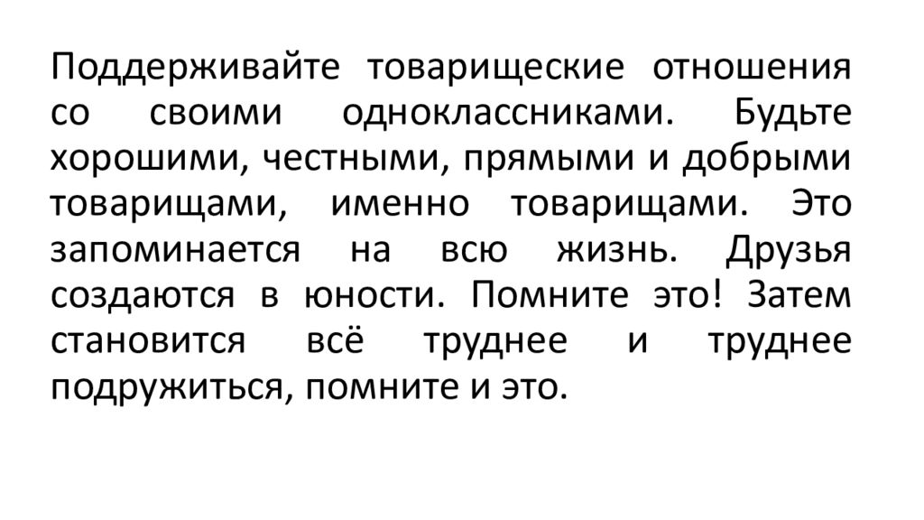 Поддерживайте товарищеские отношения со своими одноклассниками. Будьте хорошими, честными, прямыми и добрыми товарищами, именно товарищами. Это запоминается на всю жизнь. Друзья создаются в юности. Помните это! Затем становится всё труднее и труднее подружиться, помните и это.