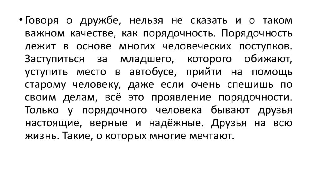 Говоря о дружбе, нельзя не сказать и о таком важном качестве, как порядочность. Порядочность лежит в основе многих человеческих поступков. Заступиться за младшего, которого обижают, уступить место в автобусе, прийти на помощь старому человеку, даже если очень спешишь по своим делам, всё это проявление порядочности. Только у порядочного человека бывают друзья настоящие, верные и надёжные. Друзья на всю жизнь. Такие, о которых многие мечтают.