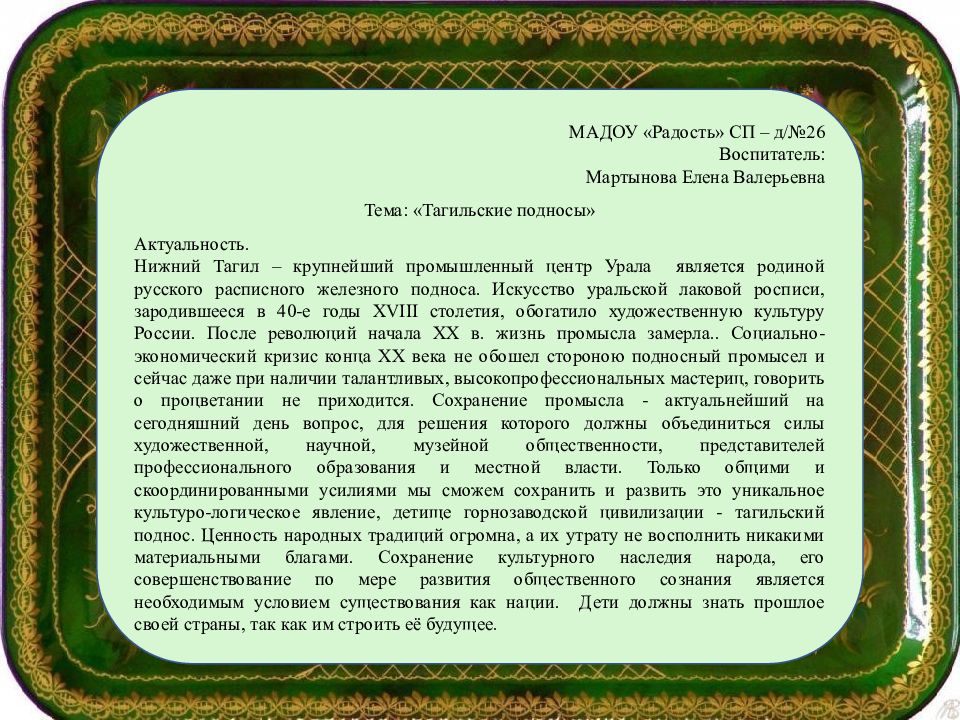 МАДОУ «Радость» СП – д/№26 Воспитатель: Мартынова Елена Валерьевна Тема: «Тагильские подносы» Актуальность. Нижний Тагил – крупнейший промышленный центр Урала является родиной русского расписного железного подноса. Искусство уральской лаковой росписи, зародившееся в 40-е годы XVIII столетия, обогатило художественную культуру России. После революций начала XX в. жизнь промысла замерла.. Социально-экономический кризис конца XX века не обошел стороною подносный промысел и сейчас даже при наличии талантливых, высокопрофессиональных мастериц, говорить о процветании не приходится. Сохранение промысла - актуальнейший на сегодняшний день вопрос, для решения которого должны объединиться силы художественной, научной, музейной общественности, представителей профессионального образования и местной власти. Только общими и скоординированными усилиями мы сможем сохранить и развить это уникальное культуро -логическое явление, детище горнозаводской цивилизации - тагильский поднос. Ценность народных традиций огромна, а их утрату не восполнить никакими материальными благами. Сохранение культурного наследия народа, его совершенствование по мере развития общественного сознания является необходимым условием существования как нации. Дети должны знать прошлое своей страны, так как им строить её будущее.