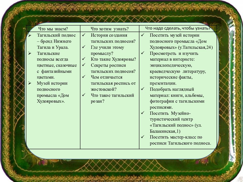 Что мы знаем? Что хотим узнать? Что надо сделать, чтобы узнать? Тагильский поднос – бренд Нижнего Тагила и Урала. Тагильские подносы всегда цветные, сказочные с фантазийными цветами. Музей истории подносного промысла «Дом Худояровых ». История создания тагильских подносов? Где учили этому промыслу? Кто такие Худояровы ? Секреты росписи тагильских подносов? Чем отличается тагильская роспись от жостовской ? Что такое тагильский розан? Посетить музей истории подносного промысла «Дом Худояровых » (у.Тагильская,24) Просмотреть и изучить материал в интернете: энциклопедическую, краеведческую литературу, исторические факты, презентации. Подобрать наглядный материал: книги, альбомы, фотографии с тагильскими росписями. Посетить Музейно-туристический центр « Тагильский поднос» (ул. Балакинская,1) Посетить мастер-класс по росписи Тагильского подноса.