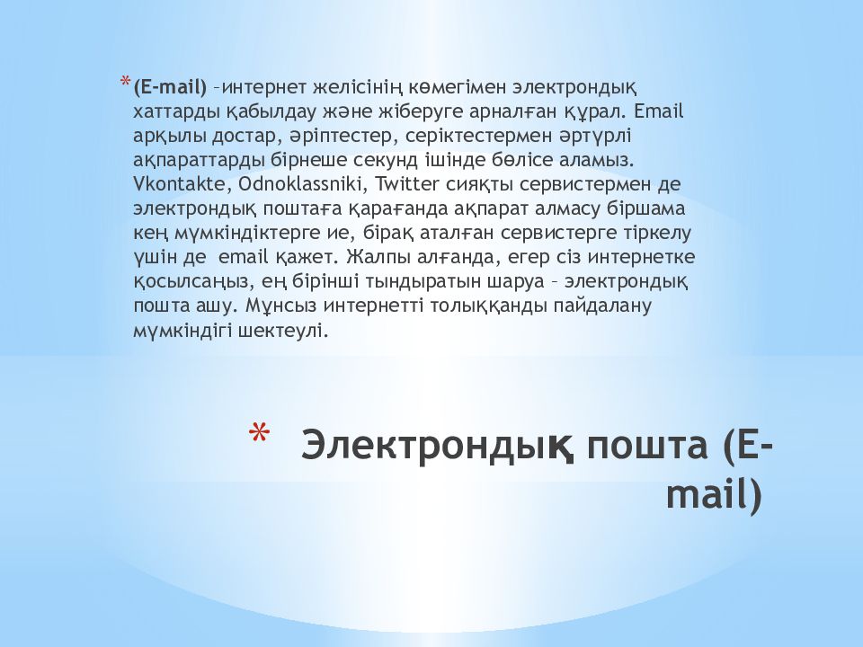 (E- mail ) –интернет желісінің көмегімен электрондық хаттарды қабылдау және жіберуге арналған құрал. E mail арқылы достар, әріптестер, серіктестермен әртүрлі ақпараттарды бірнеше секунд ішінде бөлісе аламыз. Vkontakte, Odnoklassniki, Twitter сияқты сервистермен де электрондық поштаға қарағанда ақпарат алмасу біршама кең мүмкіндіктерге ие, бірақ аталған сервистерге тіркелу үшін де email қажет. Жалпы алғанда, егер сіз интернетке қосылсаңыз, ең бірінші тындыратын шаруа – электрондық пошта ашу. Мұнсыз интернетті толыққанды пайдалану мүмкіндігі шектеулі.