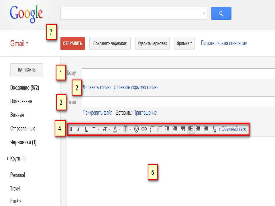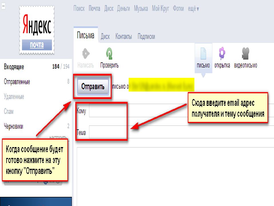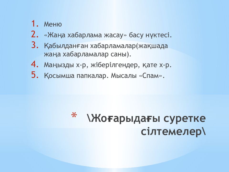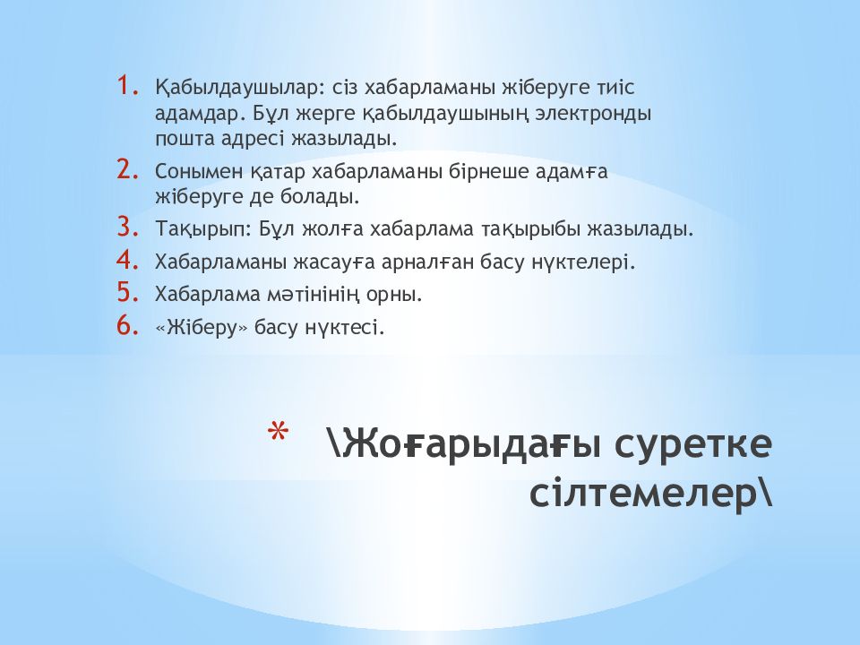Қабылдаушылар : сіз хабарламаны жіберуге тиіс адамдар. Бұл жерге қабылдаушының электронды пошта адресі жазылады. Сонымен қатар хабарламаны бірнеше адамға жіберуге де болады. Тақырып : Бұл жолға хабарлама тақырыбы жазылады. Хабарламаны жасауға арналған басу нүктелері. Хабарлама мәтінінің орны. « Жіберу » басу нүктесі.
