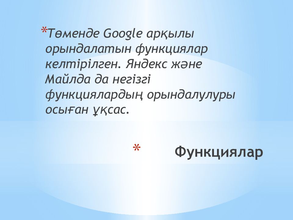 Төменде Google арқылы орындалатын функциялар келтірілген. Яндекс және Майлда да негізгі функциялардың орындалулуры осыған ұқсас.