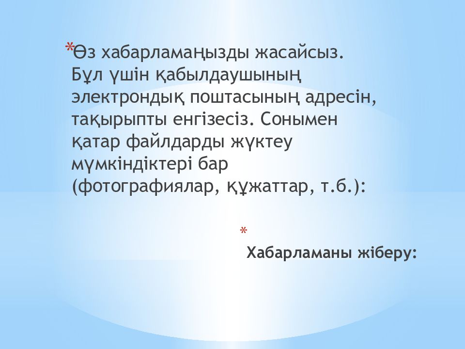 Өз хабарламаңызды жасайсыз. Бұл үшін қабылдаушының электрондық поштасының адресін, тақырыпты енгізесіз. Сонымен қатар файлдарды жүктеу мүмкіндіктері бар ( фотографиялар, құжаттар, т.б.):