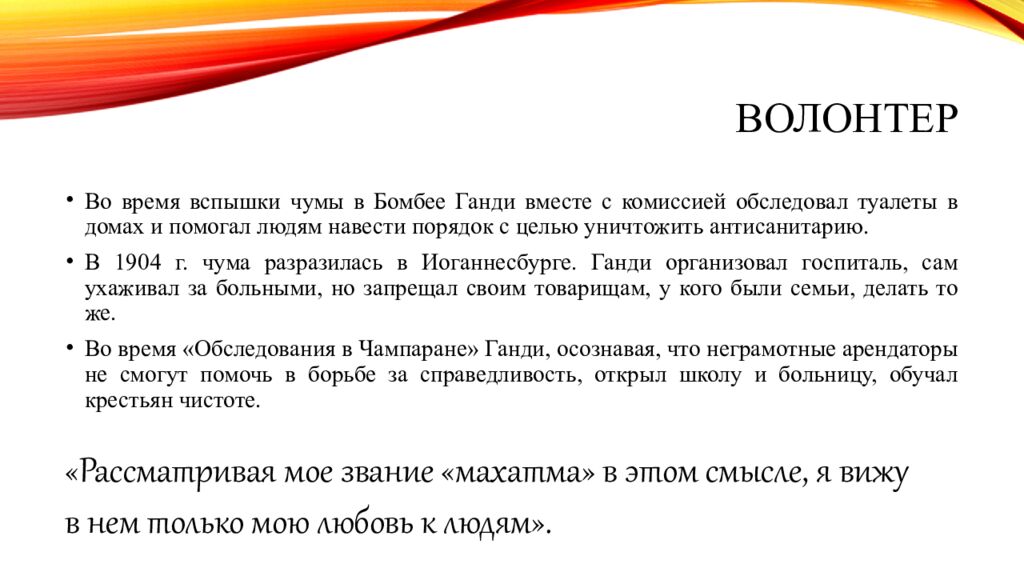 Во время вспышки чумы в Бомбее Ганди вместе с комиссией обследовал туалеты в домах и помогал людям навести порядок с целью уничтожить антисанитарию. В 1904 г. чума разразилась в Иоганнесбурге. Ганди организовал госпиталь, сам ухаживал за больными, но запрещал своим товарищам, у кого были семьи, делать то же. Во время «Обследования в Чампаране » Ганди, осознавая, что неграмотные арендаторы не смогут помочь в борьбе за справедливость, открыл школу и больницу, обучал крестьян чистоте. «Рассматривая мое звание «махатма» в этом смысле, я вижу в нем только мою любовь к людям».