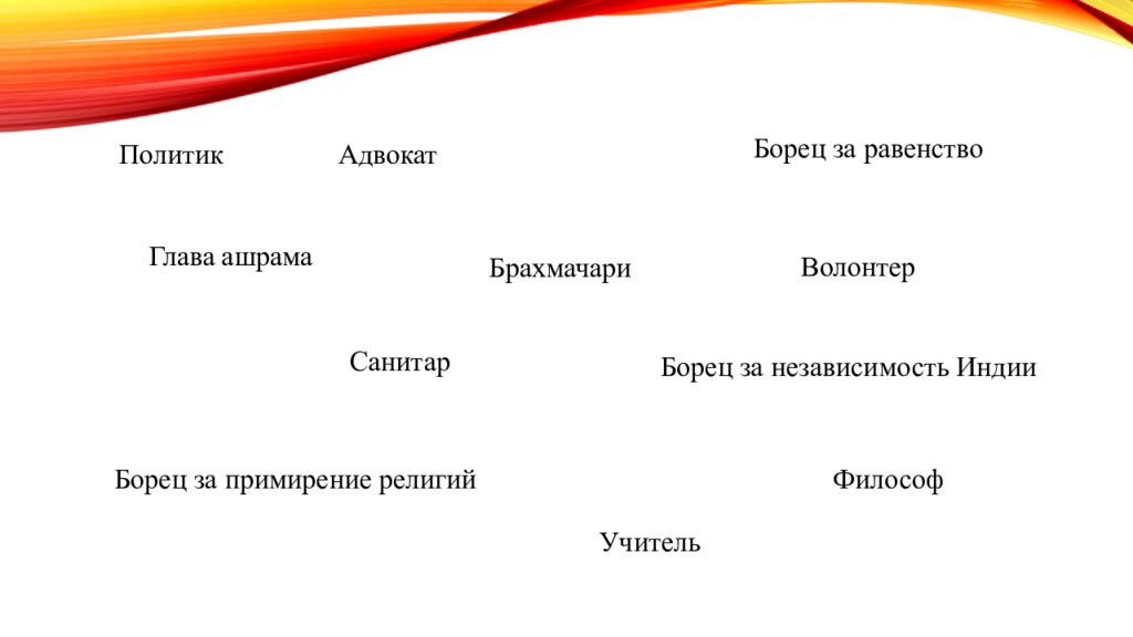 Глава а шрама Политик Борец за равенство Адвокат Борец за независимость Индии Санитар Борец за примирение религий Брахмачари Философ Волонтер Учитель