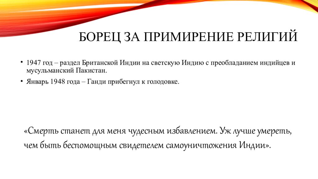 1947 год – раздел Британской Индии на светскую Индию с преобладанием индийцев и мусульманский Пакистан. Январь 1948 года – Ганди прибегнул к голодовке. «Смерть станет для меня чудесным избавлением. Уж лучше умереть, чем быть беспомощным свидетелем самоуничтожения Индии».
