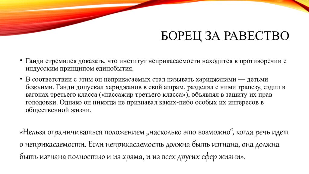 Ганди стремился доказать, что институт неприкасаемости находится в противоречии с индусским принципом единобытия. В соответствии с этим он неприкасаемых стал называть хариджанами — детьми божьими. Ганди допускал хариджанов в свой ашрам, разделял с ними трапезу, ездил в вагонах третьего класса («пассажир третьего класса»), объявлял в защиту их прав голодовки. Однако он никогда не признавал каких-либо особых их интересов в общественной жизни. «Нельзя ограничиваться положением „насколько это возможно“, когда речь идет о неприкасаемости. Если неприкасаемость должна быть изгнана, она должна быть изгнана полностью и из храма, и из всех других сфер жизни».