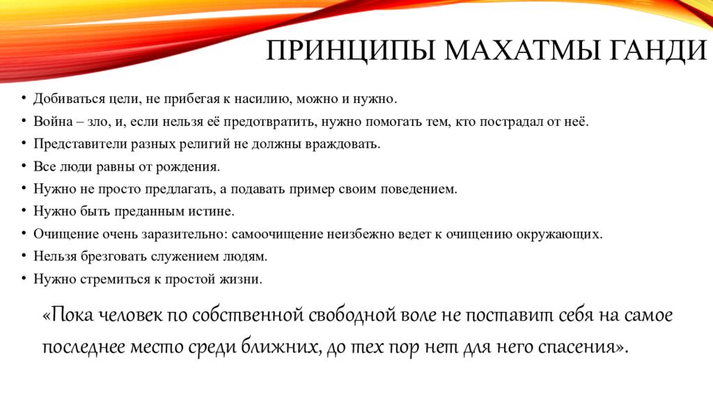 Последний слайд презентации: Махатма Ганди и его идеи достижения мира: Принципы Махатмы Ганди