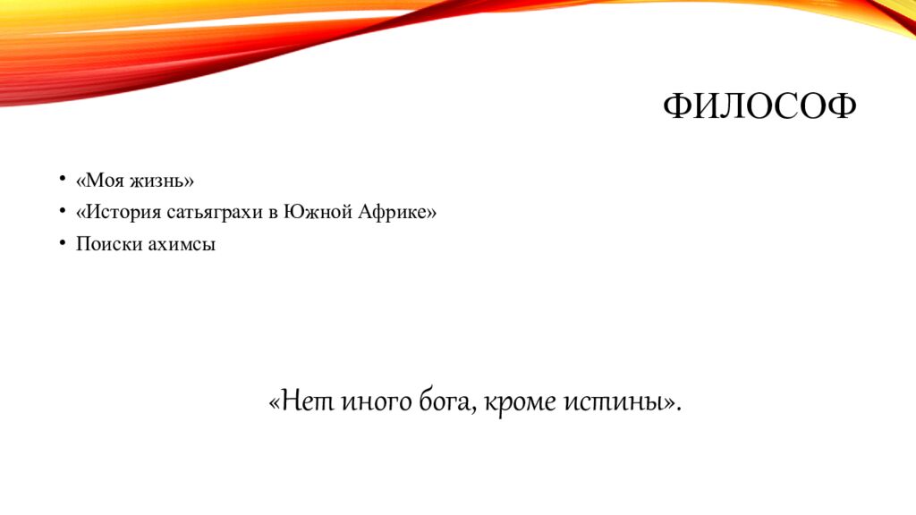 «Моя жизнь» «История сатьяграхи в Южной Африке» Поиски ахимсы «Нет иного бога, кроме истины».