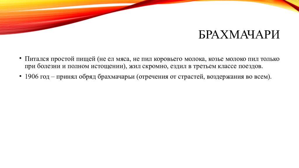 Питался простой пищей (не ел мяса, не пил коровьего молока, козье молоко пил только при болезни и полном истощении), жил скромно, ездил в третьем классе поездов. 1906 год – принял обряд брахмачарьи (отречения от страстей, воздержания во всем).