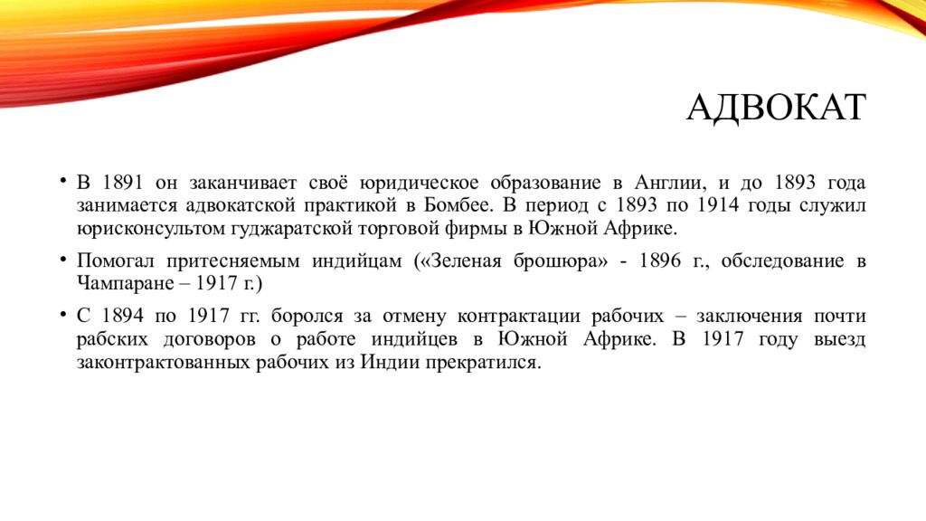 В 1891 он заканчивает своё юридическое образование в Англии, и до 1893 года занимается адвокатской практикой в Бомбее. В период с 1893 по 1914 годы служил юрисконсультом гуджаратской торговой фирмы в Южной Африке. Помогал притесняемым индийцам («Зеленая брошюра» - 1896 г., обследование в Чампаране – 1917 г.) С 1894 по 1917 гг. боролся за отмену контрактации рабочих – заключения почти рабских договоров о работе индийцев в Южной Африке. В 1917 году выезд законтрактованных рабочих из Индии прекратился.