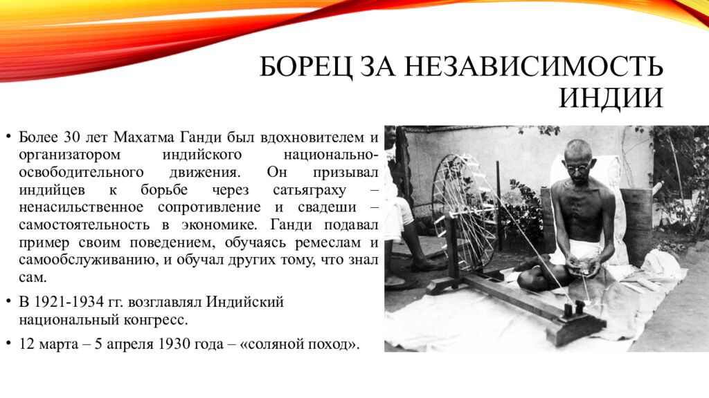 Более 30 лет Махатма Ганди был вдохновителем и организатором индийского национально-освободительного движения. Он призывал индийцев к борьбе через сатьяграху – ненасильственное сопротивление и свадеши – самостоятельность в экономике. Ганди подавал пример своим поведением, обучаясь ремеслам и самообслуживанию, и обучал других тому, что знал сам. В 1921-1934 гг. возглавлял Индийский национальный конгресс. 12 марта – 5 апреля 1930 года – «соляной поход».