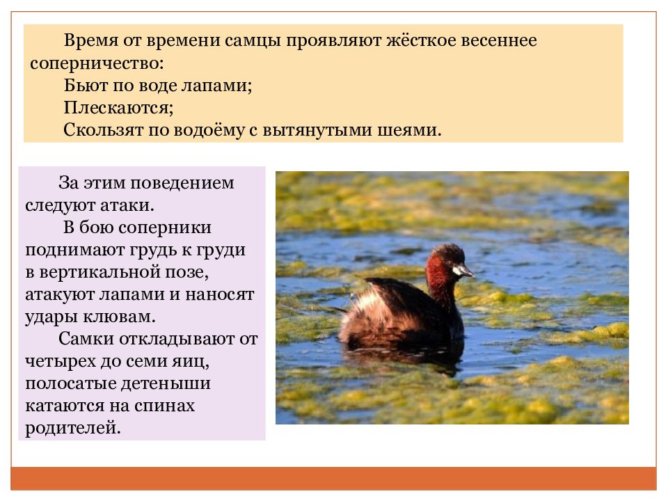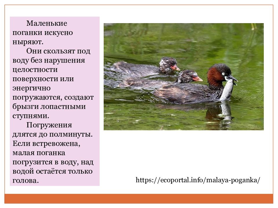 Маленькие поганки искусно ныряют. Они скользят под воду без нарушения целостности поверхности или энергично погружаются, создают брызги лопастными ступнями. Погружения длятся до полминуты. Если встревожена, малая поганка погрузится в воду, над водой остаётся только голова. https://ecoportal.info/malaya-poganka/