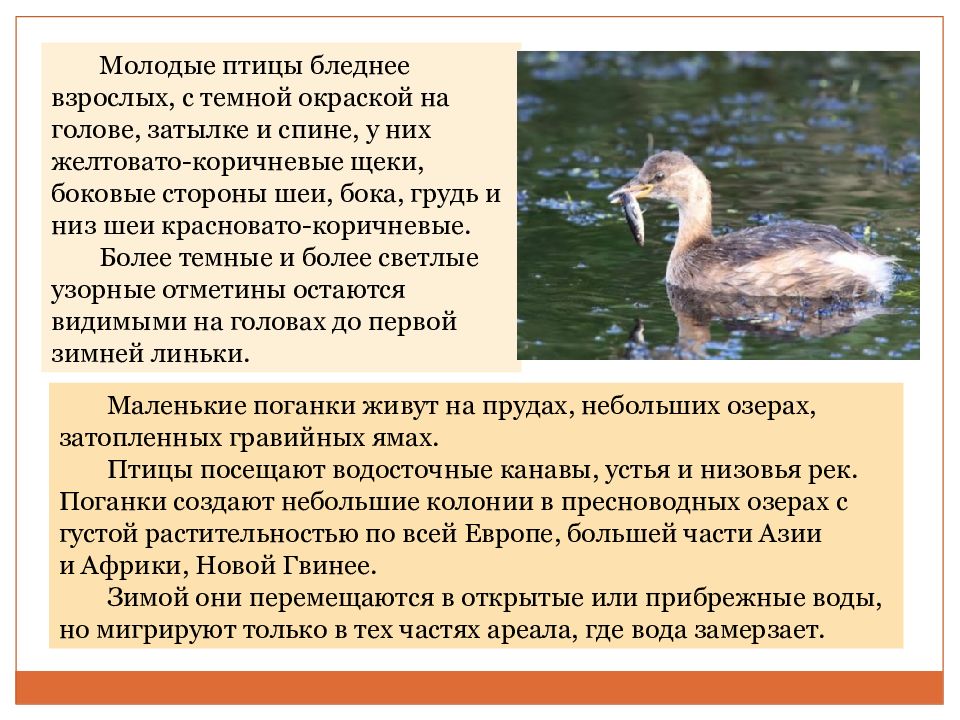 Молодые птицы бледнее взрослых, с темной окраской на голове, затылке и спине, у них желтовато-коричневые щеки, боковые стороны шеи, бока, грудь и низ шеи красновато-коричневые. Более темные и более светлые узорные отметины остаются видимыми на головах до первой зимней линьки. Маленькие поганки живут на прудах, небольших озерах, затопленных гравийных ямах. Птицы посещают водосточные канавы, устья и низовья рек. Поганки создают небольшие колонии в пресноводных озерах с густой растительностью по всей Европе, большей части Азии и Африки, Новой Гвинее. Зимой они перемещаются в открытые или прибрежные воды, но мигрируют только в тех частях ареала, где вода замерзает.