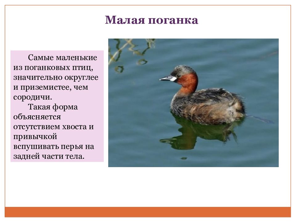 Малая поганка Самые маленькие из поганковых птиц, значительно округлее и приземистее, чем сородичи. Такая форма объясняется отсутствием хвоста и привычкой вспушивать перья на задней части тела.