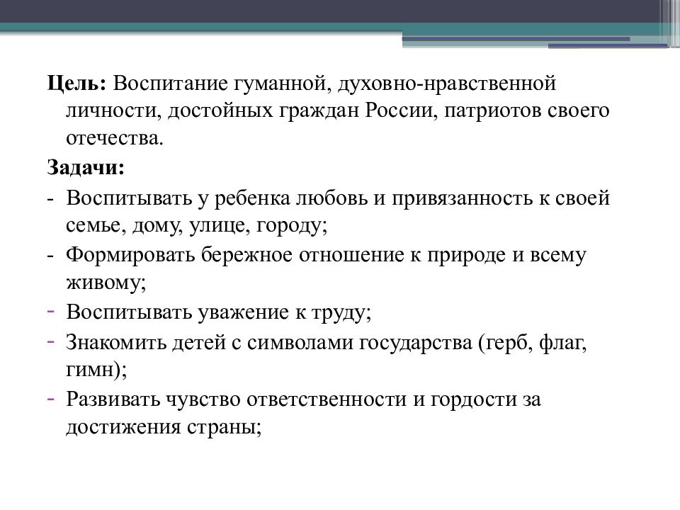 Цель: Воспитание гуманной, духовно-нравственной личности, достойных граждан России, патриотов своего отечества. Задачи: - Воспитывать у ребенка любовь и привязанность к своей семье, дому, улице, городу ; - Формировать бережное отношение к природе и всему живому ; Воспитывать уважение к труду ; Знакомить детей с символами государства (герб, флаг, гимн) ; Развивать чувство ответственности и гордости за достижения страны ;