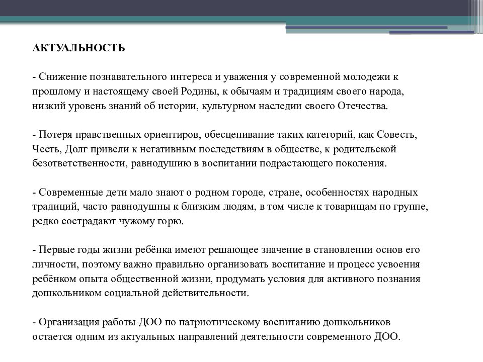 АКТУАЛЬНОСТЬ - Снижение познавательного интереса и уважения у современной молодежи к прошлому и настоящему своей Родины, к обычаям и традициям своего народа, низкий уровень знаний об истории, культурном наследии своего Отечества. - Потеря нравственных ориентиров, обесценивание таких категорий, как Совесть, Честь, Долг привели к негативным последствиям в обществе, к родительской безответственности, равнодушию в воспитании подрастающего поколения. - Современные дети мало знают о родном городе, стране, особенностях народных традиций, часто равнодушны к близким людям, в том числе к товарищам по группе, редко сострадают чужому горю. - Первые годы жизни ребёнка имеют решающее значение в становлении основ его личности, поэтому важно правильно организовать воспитание и процесс усвоения ребёнком опыта общественной жизни, продумать условия для активного познания дошкольником социальной действительности. - Организация работы ДОО по патриотическому воспитанию дошкольников остается одним из актуальных направлений деятельности современного ДОО.