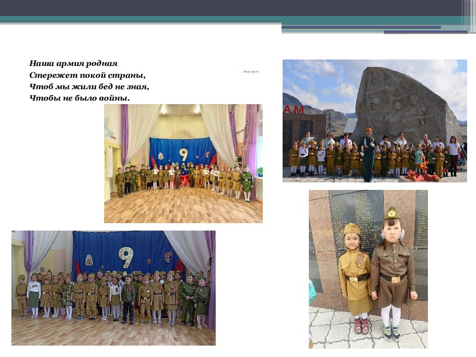Наша армия родная Стережет покой страны, Чтоб мы жили бед не зная, Чтобы не было войны.