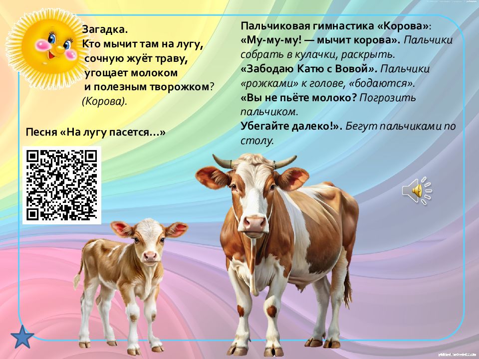 Загадка. Кто мычит там на лугу, сочную жуёт траву, угощает молоком и полезным творожком ? ( Корова). Пальчиковая гимнастика «Корова » : « Му-му-му ! — мычит корова». Пальчики собрать в кулачки, раскрыть. «Забодаю Катю с Вовой ». Пальчики «рожками» к голове, «бодаются». «Вы не пьёте молоко? Погрозить пальчиком. Убегайте далеко!». Бегут пальчиками по столу. Песня «На лугу пасется…»